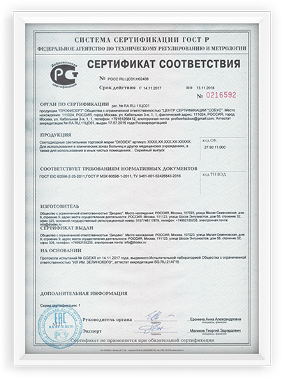 Компания DIODEX производит светильники в соответствии с международными стандартами. Поэтому мы можем предложить разные варианты для организации системы освещения самым разным объектам. Все товары сертифицированы в соответствии с Техническим регламентом Таможенного Союза, имеет все необходимые протоколы испытаний в аккредитованных светотехнических лабораториях.